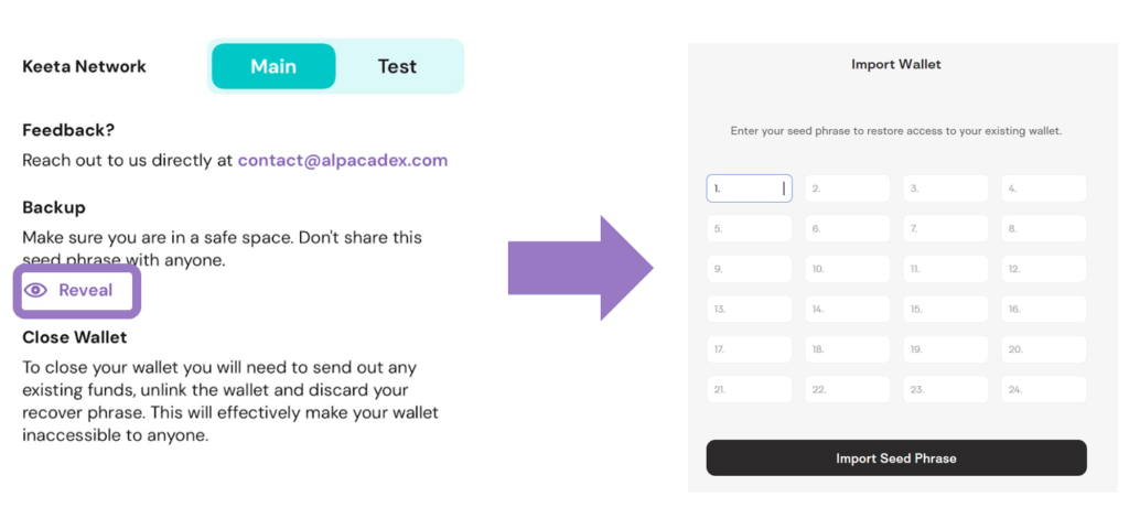 In this example, the wallet was first created inside the Alpaca app, and the seed phrase was then copied into wallet.keeta.com to access the same account.