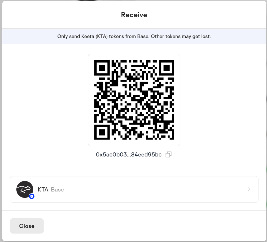 This will show you the Keeta address that accepts KTA transfers coming from Base.